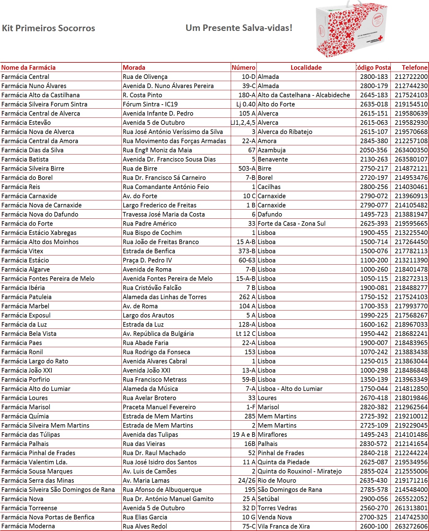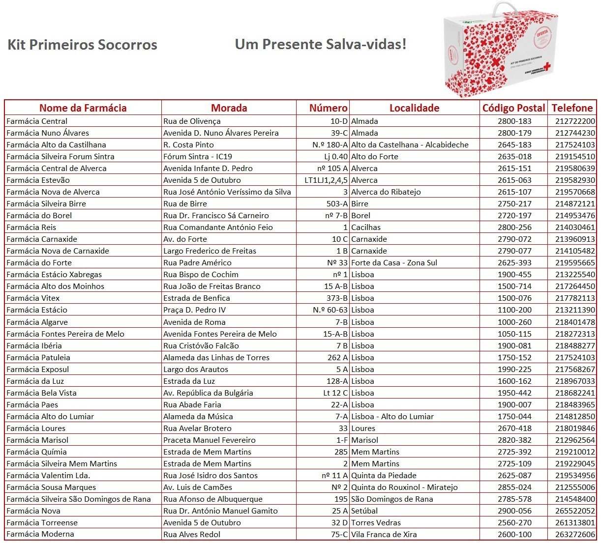 A saúde dos Portugueses está no centro da atenção da Cruz Vermelha Portuguesa (CVP). Por essa razão, a CVP, em conjunto com a Escola de Socorrismo e o Hospital da Cruz Vermelha, desenvolveu um “Kit de Primeiros Socorros– Uma Mala Salva-vidas”. Este Kit é lançado no âmbito de uma campanha de sensibilização em saúde, mais concretamente nas áreas de socorrismo e de prevenção de doenças cardiovasculares e morte súbita.